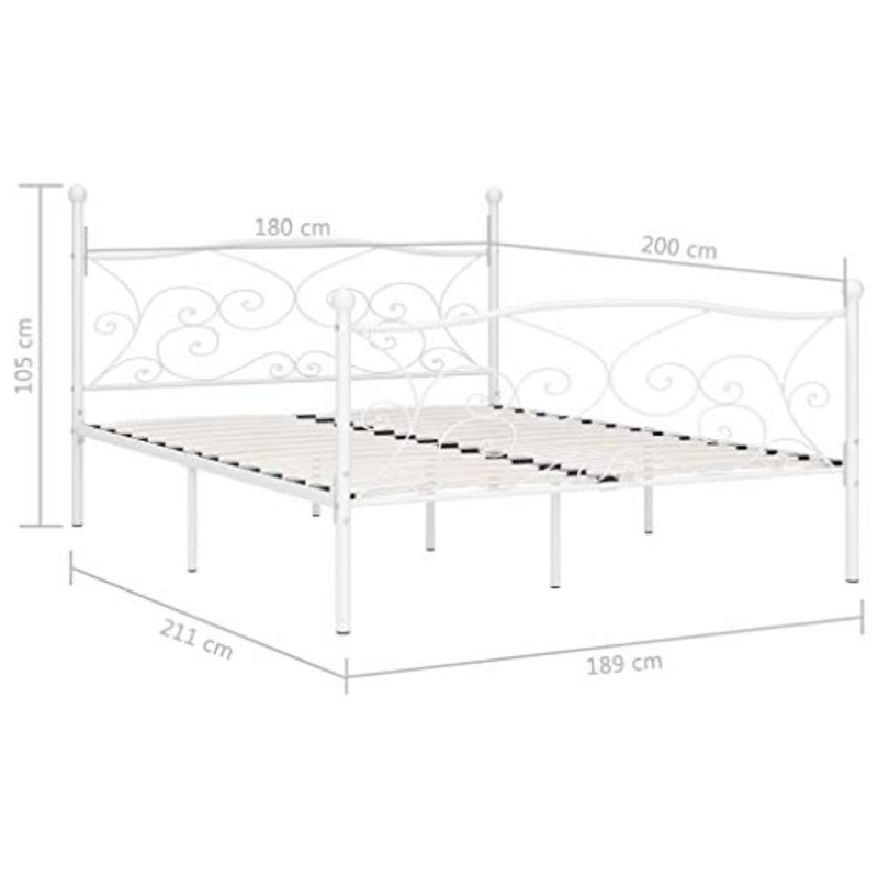Dettagli: Donate un aspetto elegante e classico in camera da letto grazie al nostro giroletto in metallo! Il giroletto caratterizzato da una robusta struttura in metallo. Le resistenti doghe in compensato offrono una base di supporto adatta e sono estremamente confortevoli. Il design elegante va ad esaltare lo stile moderno del letto. Grazie alla combinazione di tutte queste caratteristiche, sarete sicuramente in grado di godervi il meritato riposo notturno! Il giroletto facile da assemblare. Si prega di notare che la consegna include un giroletto con una rete a doghe; il materasso non incluso. Potete fare riferimento al nostro negozio per i materassi da abbinare.Colore: BiancoMateriale: Metallo, compensatoDimensioni complessive: 211 x 189 x 105 cm (L x P x A)Dimensioni materasso adatto: 180 x 200 cm (P x L) (materasso non incluso)Altezza da terra: 28 cmSponde laterali con fioreGiroletto con dogheAssemblaggio necessario: Si