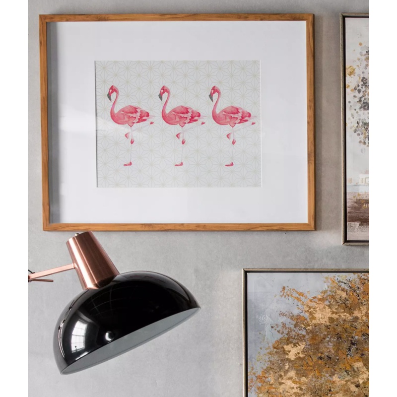 A trio of brightly coloured flamingos, presented in a window mount and a wood-effect frame, ready to hang on your wall.Dimensions :H 58.5 x W 73.5 x D 3cm