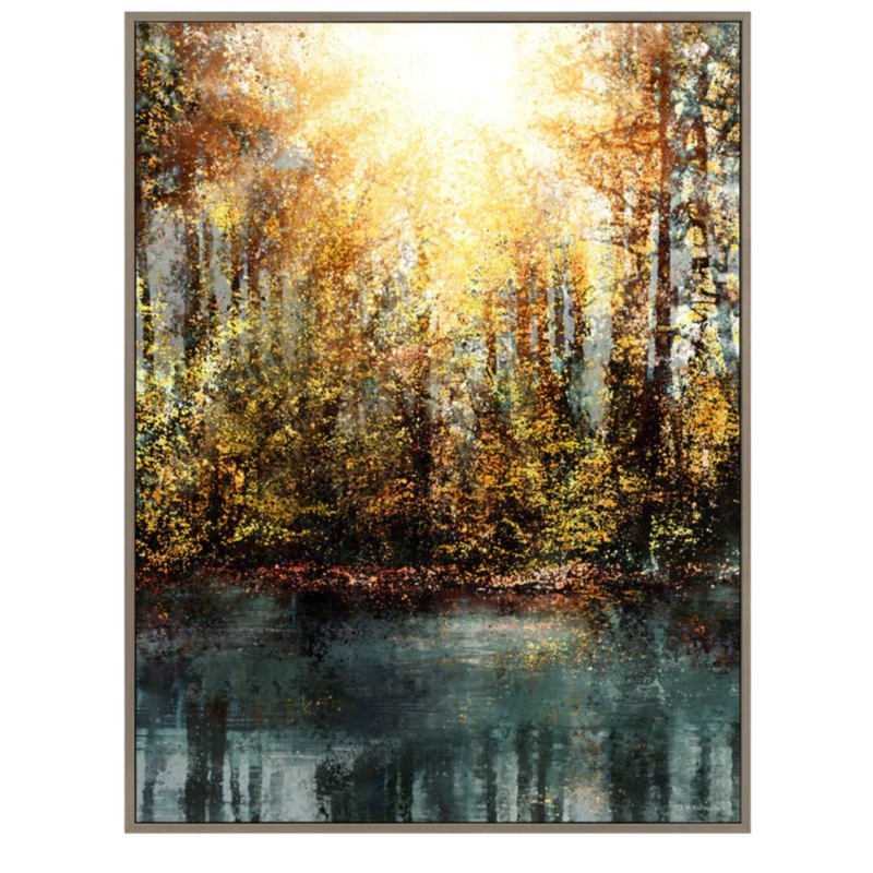 Ulyana Hammonds Forest Glow depicts a lush landscape by the water. Hammonds piercing colour palette is so lifelike it almost extends out of the canvas.83 x 63cm