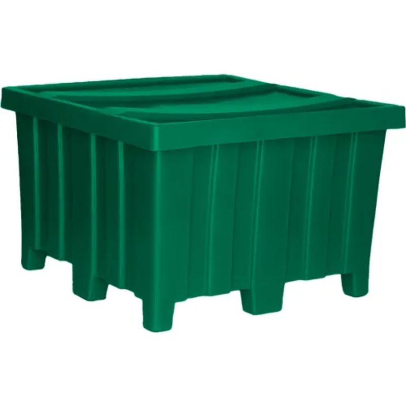 Ideal for shipping and storage applications. Ribbed reinforced construction provides maximum durability. 100% recyclable polyethylene resists chemicals, corrosion and impact. Excellent for food service applications. Containers stack 3 high for space-saving. Includes factory installed lid.