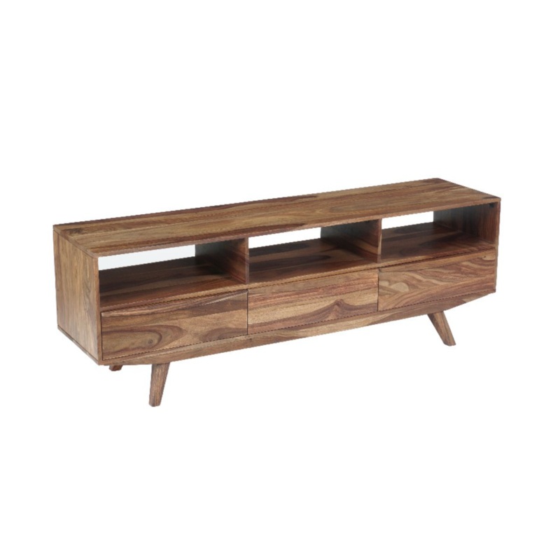 The mid-century modern solid sheesham Fusion TV Stand features three drawers and three open storage spaces for convenient media storage. It is an heirloom quality piece built to stand up to modern life. With chic flaired legs and curved drawer pulls, the c