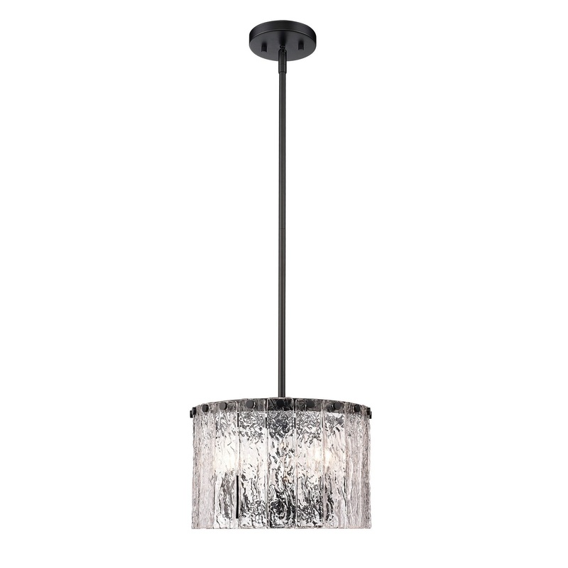 Embellish a custom living space with the industrial version of modern glam, choosing this striking fixture as a reference point and source of glowing illumination. The Glacier three-light pendant delivers a lush aesthetic with individual clear textured glass panels that emulate melting ice, a chic design with dramatic impact. Bold matte black finish steel is placed as a crown fraB208:B217me, providing tantalizing contrast and enhancing the gallery feel of a foyer or main living space with both natural and industrial inspiration.