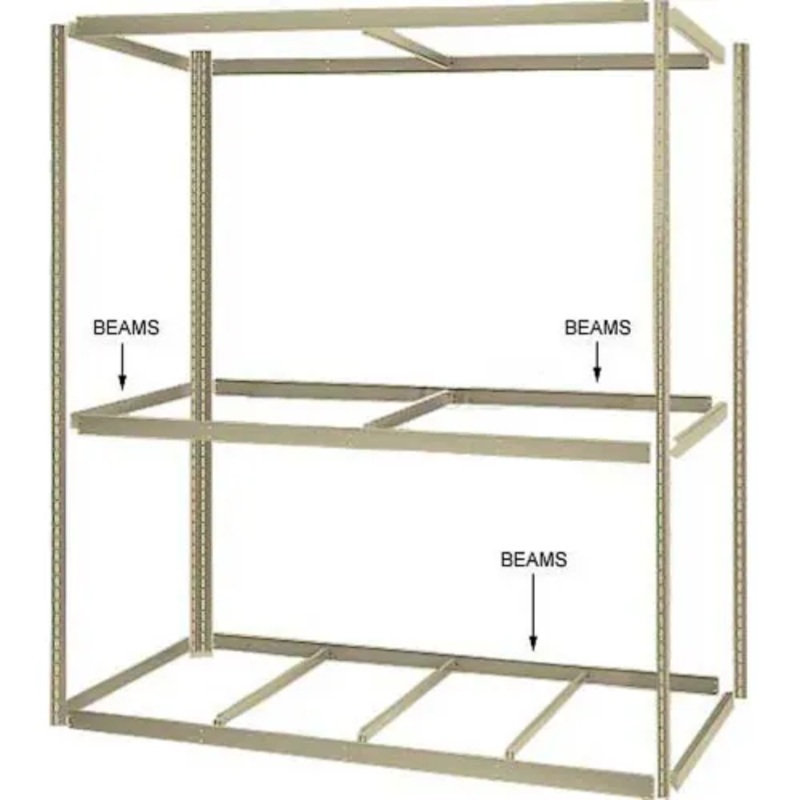 Each Level Requires four beams. Use Double Rivet Beams on top and bottom levels of all units. Use Single Rivet Beams on all intermediate levels, or increase capacity by using Double Rivet Beams on all levels. Beams can be used as ledges at any required hei