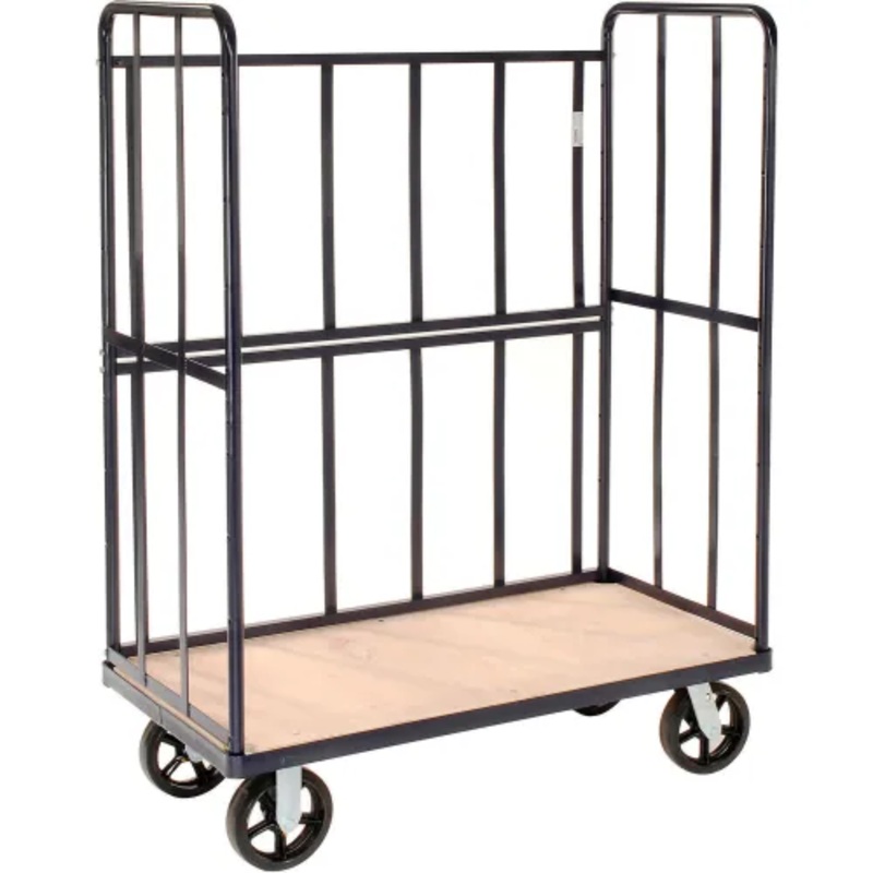 High-End Shelf Truck is perfect for both storage and transportation of bulky packages. Sturdy 1-1/2" x 1/8" angle iron frame for long life. Reinforced and welded cross-braced frame and twin end frames have a durable enamel finish. Strong 3/4" thick plywood