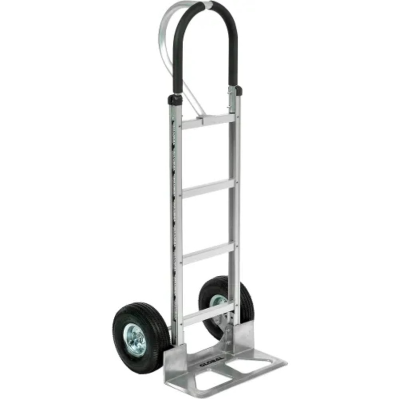 High strength aluminum construction offers lightweight alternative to heavier steel hand trucks. Exclusive 4 rail design offers 33% greater frame reinforcement to ensure long life. 12″ wide frame has protective polyethylene rail caps. Large 18″ x 7-1/2″ beveled noseplate accepts bulky loads and has integral wheel guards to protect cargo. Comfortable anti-slip grips for safety. Pneumatic wheels offer smooth ride over rough terrain. Easy assembly. 2 Year Limited Warranty.