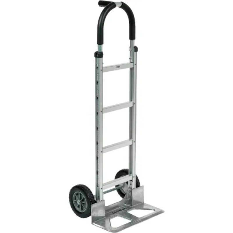High strength aluminum construction offers lightweight alternative to heavier steel handtrucks. Exclusive 4 rail design offers 33% greater frame reinforcement to ensure long life. 12″ wide frame has protective polyethylene rail caps. Large 18″ x 7-1/2″ beveled noseplate accepts bulky loads and has integral wheel guards to protect cargo. Comfortable anti-slip grips for safety. Mold-on Rubber wheels offer long life and lightest weight. Easy assembly. 2 Year Limited Warranty.
