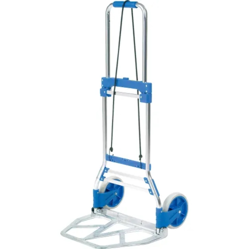 Global Industrial Folding Hand CartEasy to fold flat in secondsDon't be fooled by this lightweight, low profile collapsible hand cart because the strong aluminum frame handles up to a 275-lb. load. Folds flat in seconds with the push of a button that autom