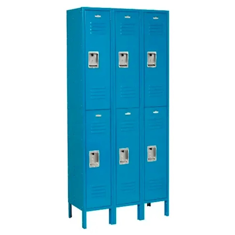 Door handle with fingertip lift latch is recessed into the door face to create a smooth catch-free surface, to discourage the padlock from being cut off and to provide a neat, clean look. The results are improved safety, security and appearance. These quality lockers feature 16 gauge steel doors, 5-knuckle security hinge and welded, reinforced frame-and-door assemblies. Extra wide louvers promote ventilation. Lockers must be anchored securely to floors. 1-wide and 3-wide lockers have four foot plates included. Foot plates bolt to outside locker leg supports and maybe anchored to the floor. Anchors sold separately. Legs add 6″ to height. Includes blank number plates. Lockers have secure 2-point positive locking system, stainless steel door latch and double and single-prong coat hooks. 1 Year Limited Warranty.