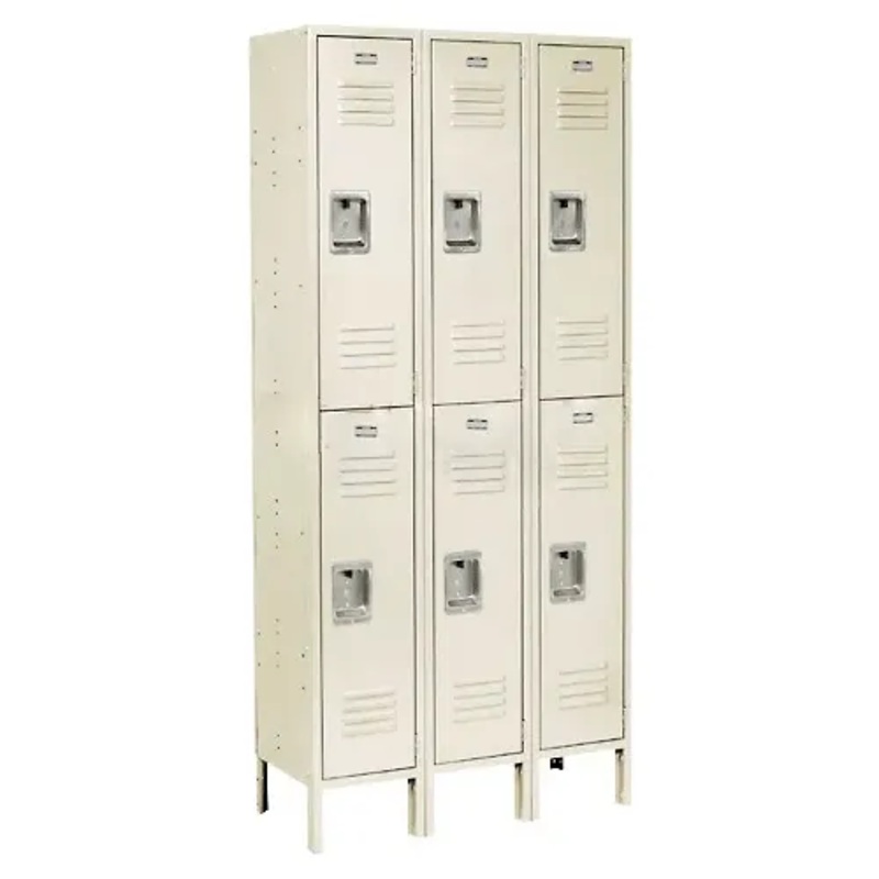 Door handle with fingertip lift latch is recessed into the door face to create a smooth catch-free surface, to discourage the padlock from being cut off and to provide a neat, clean look. The results are improved safety, security and appearance. These quality lockers feature 16 gauge steel doors, 5-knuckle security hinge and welded, reinforced frame-and-door assemblies. Extra wide louvers promote ventilation. Lockers must be anchored securely to floors. 1-wide and 3-wide lockers have four foot plates included. Foot plates bolt to outside locker leg supports and maybe anchored to the floor. Anchors sold separately. Legs add 6″ to height. Includes blank number plates. Lockers have secure 2-point positive locking system, stainless steel door latch and double and single-prong coat hooks.