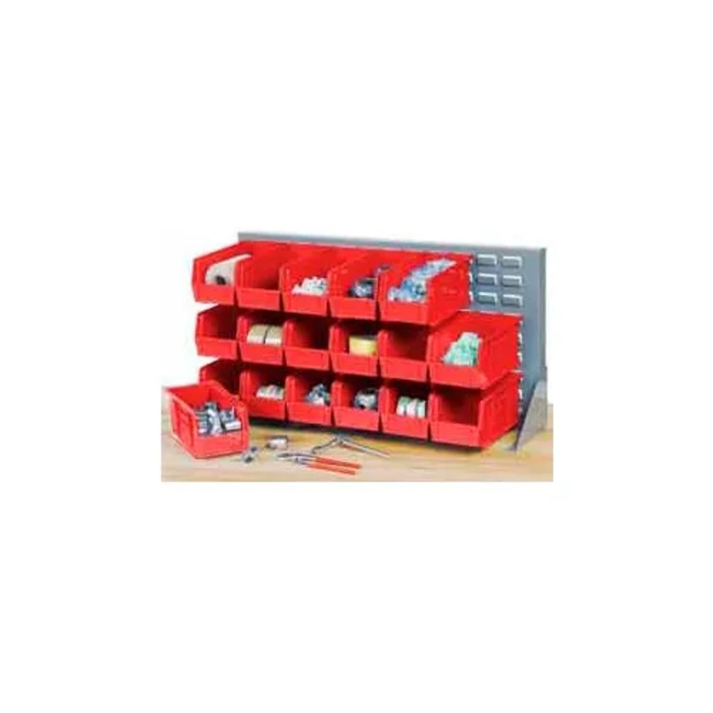 Louvered Bench Rack 36"W x 20"H with 18 of Red Premium Stacking Bins Organize, transport and store parts, components and hardware withmaximum efficiency. Heavy-duty 16-gauge steel louvered bin rack provideseasy removal of polypropylene bins. Free standing