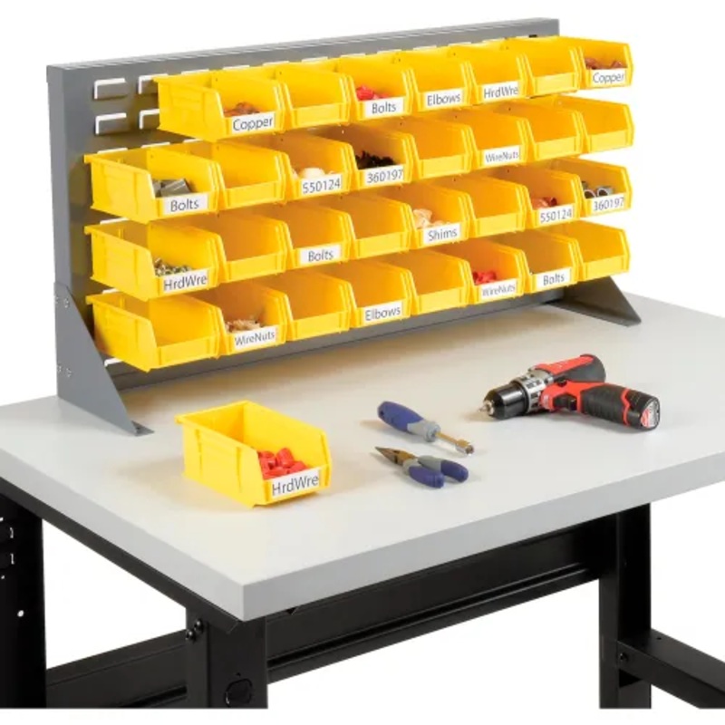 Louvered Bench Rack 36"W x 20"H with 32 of Yellow Premium Stacking Bins Organize, transport and store parts, components and hardware withmaximum efficiency. Heavy-duty 16-gauge steel louvered bin rack provideseasy removal of polypropylene bins. Free standi