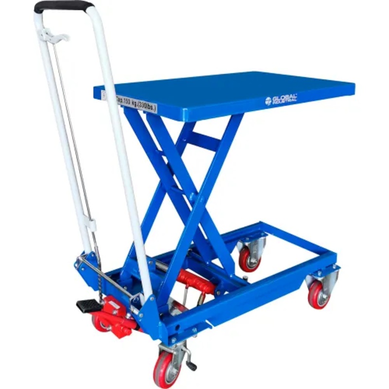 This manually-operated Global Industrial Mobile Single Scissor Lift Table is an ergonomic & efficient solution to lifting, transporting, and positioning heavy loads. Constructed from heavy-gauge steel, this lift table uses a foot-operated hydraulic pump to position loads of up to 330 lbs. within reach, reducing the risk of workplace injuries including strains. It rolls easily throughout your facility on polyurethane casters and features an anti-slip rubber handle and foot pedal. Limited 2-Year Warranty.