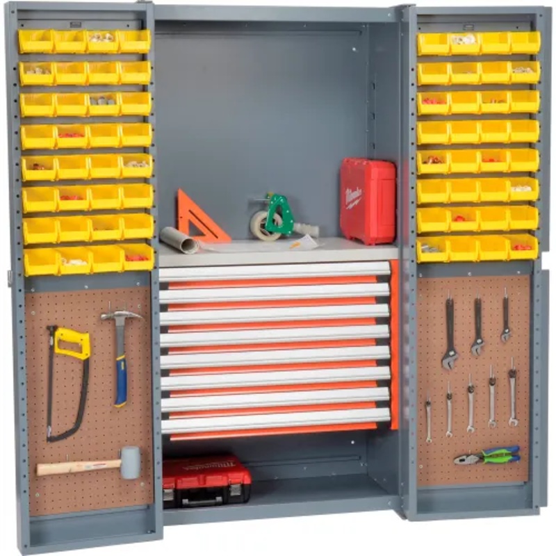 Security work centers are built with high quality steel and are built to last. Features 4″ deep pocket doors, 100 lb. capacity shelves ,and louvered panels allow for easy bin attachment and removal. Pegboards for easy tool retreival. Height adjustable door shelves for customized storage configurations. Includes a 1-3/4″ plastic work surface. Cut resistant hasp and padlock hatch for added security. Chrome handles. Doors open 270 for full access.