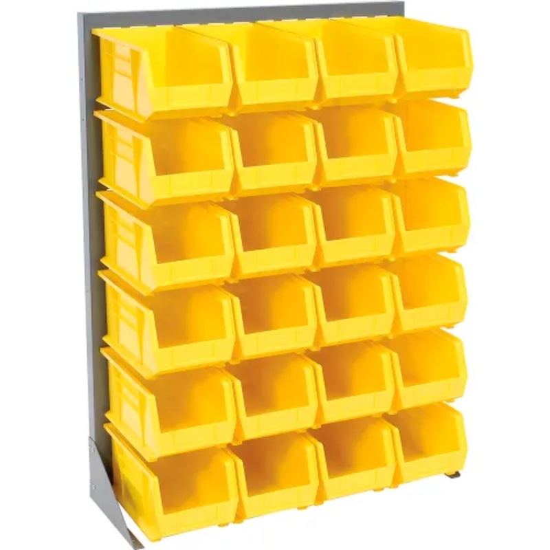 Singled Sided Louvered Bin Rack 35"W x 15"D x 50"H with 24 of Yellow Premium Stacking BinsOrganize, transport and store parts, components and hardware withmaximum efficiency. Heavy-duty 16-gauge steel louvered bin rack provideseasy removal of polypropylene