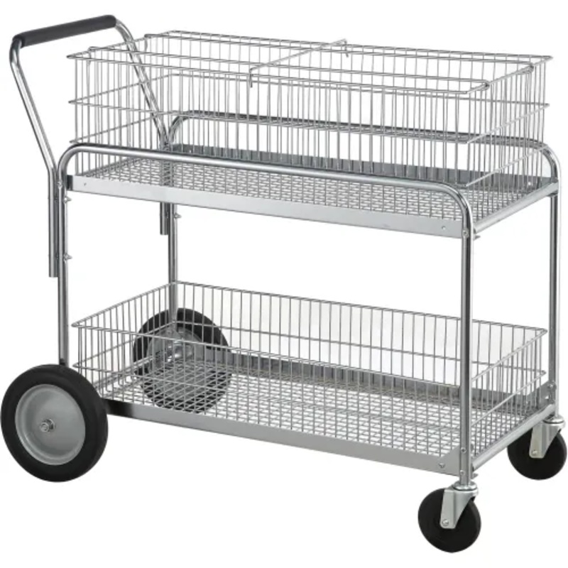 Keep mail and office files organized with our Deluxe Mail Carts. This chrome-plated wire shelf mail carrier cart has a capacity of 200 lbs. and includes rails for hanging file folders. Our mobile file cart also comes equipped with removable upper and lower chrome-plated wire baskets.