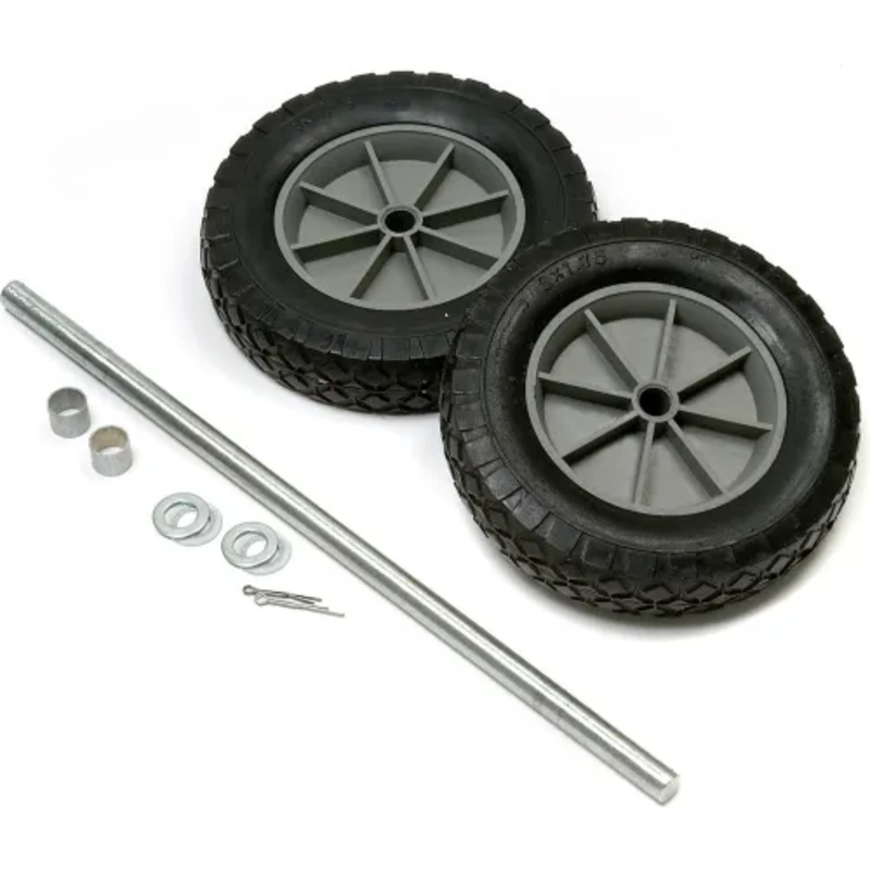 REPLACEMENT MOLD-ON RUBBER WHEEL KITReplace broken, faulty and ineffective wheels. Wheel kit includes two wheels, a 5/8" diameter x 18"L axle, 4 washers and 2 cotter pins. Add or subtract washers as necessary to adjust frame spacing. Fits most hand truck f