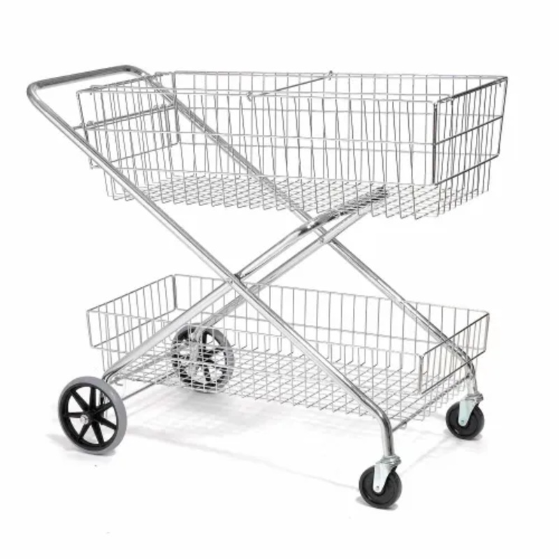 Rugged 1” round tubular steel frame. Extra large heavy duty welded steel baskets transport bulky items easily. 36” x 16” x 11”H upper basket. Removable 35″ x 15-3/4” x 7”H lower basket. File rails included to accommodate hanging files. Two 4” swivel rubber wheel casters in front. Two rigid semi-pneumatic wheels in back for easy mobility. This product does not fold. Nickel-chrome plated. Assembles in minutes.