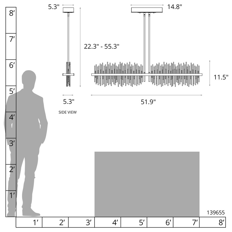 The linear Gossamer Pendant Large is suspended by two central rods. A multitude of thin, steel rods pierce the LED lightguide that is encased in its frame, creating a wash of up-and-down light. Offered as a two-toned option with canopy/rods/frame finish +