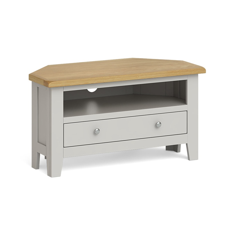 Upgrade your living room with the Guilsfield Corner Tv Unit. Its modern country charm and hand-painted soft grey finish make it a stunning addition to any interior. Featuring a lacquer natural oak top and shaker leg for added elegance. Create a light, bright and welcoming space with this piece.