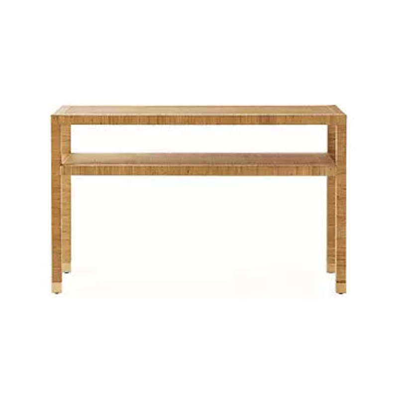 The Hayes console table combines natural rattan craftsmanship with elegant brass feet, offering a refined yet organic aesthetic. Its lightweight design makes it versatile for entryways or living spaces, while the brass accents provide stability and a touch