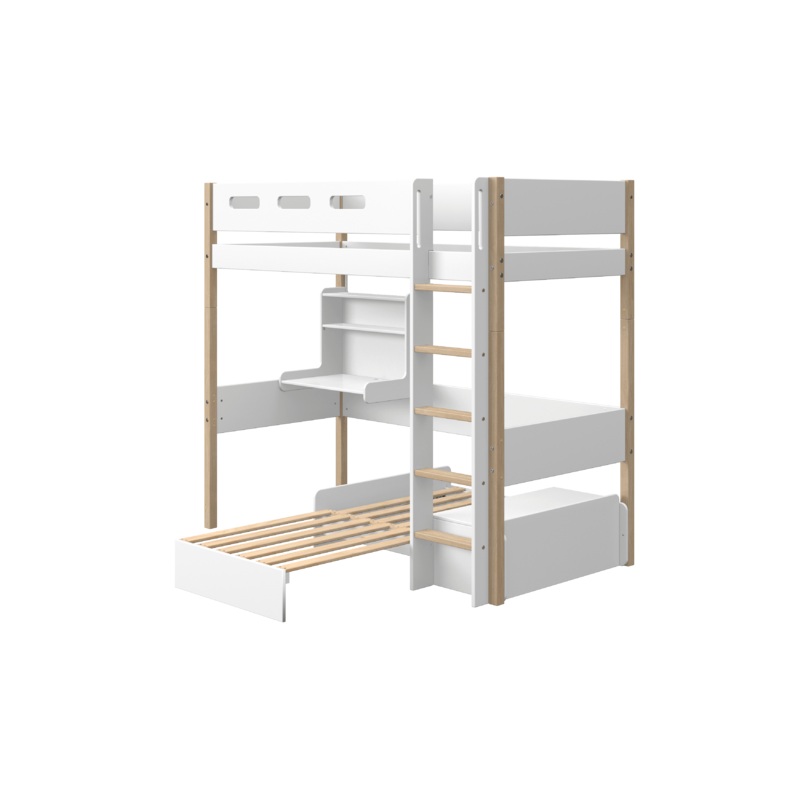 WHITE casa high bed with integrated sleeping module and click-on desk. The perfect bed for the teens, who needs extra space underneath the bed for a desk and room for sleepovers. The bed has straight ladder with anti-slip steps and interated handles.The be