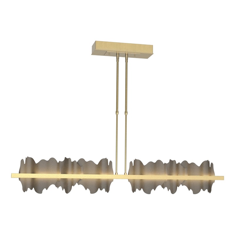 The Hildene Pendant features metal plates crafted into dramatic hills and valleys that are illuminated by LED lightguides encased in its central frame. A large, linear pendant suspended by two central rods, the Hildene is offered with a two-toned finish op