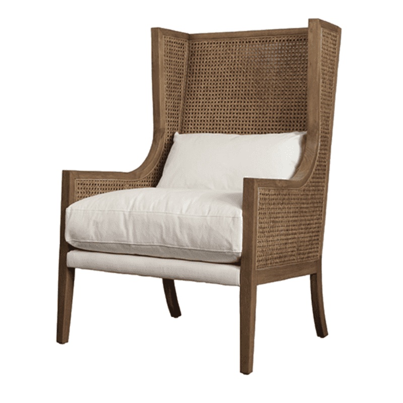 The Jaden Rattan Accent Chair is the perfect vintage coastal chair for the home. It has a solid oak frame finished in a warm brown hue combined with an open weave, cane rattan back and sides. The Jaden comes with a cotton, stone-washed white fabric cushion and low lumbar pillow.