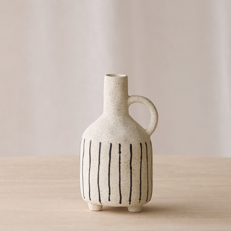 Brand: Nomad HomeThe Jonai Vase is a stylish ceramic piece with a smooth cream finish with black accents. Its understated elegance makes it a perfect addition to any interior, serving as a beautiful standalone decoration or as a vessel for displaying flowe