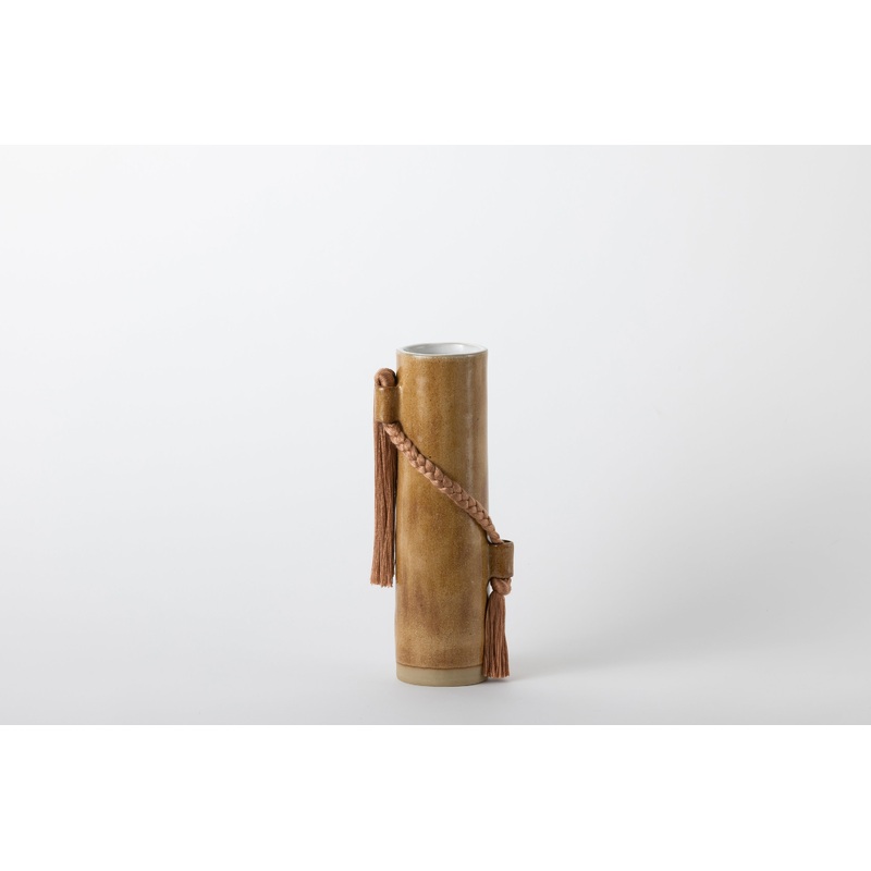 Handcrafted in Karen Tinneys Vermont studio, the Amber Vase is a generously sized ceramic piece with cotton fringe, perfect for large floral arrangements or as a sculptural feature. It showcases a warm amber finish and a glazed interior.