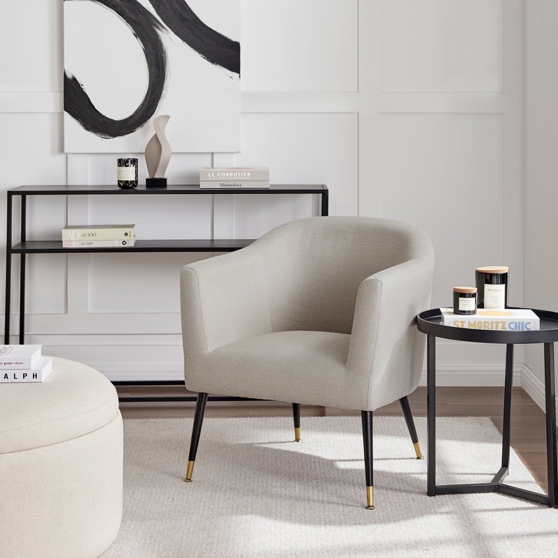 Made with a premium linen look fabric in a neutral shade of cool grey, this accent chair blends curved, angular lines for a classic yet contemporary finish. Featuring black metal legs with gold effect tips, this accent chair also has a durable seat pad, providing complete comfort as you work, read or relax.