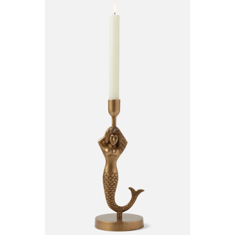 Whimsy meets the ocean. Made of antique brass, the mermaid stands proudly as she presents tapered candles.Overall Dimensions:4.25"W x 11.5"HMaterial: Solid BrassFinish: Antique GoldAdditional Details:Sold in a set.Wipe with a damp cloth.Candle sold separat