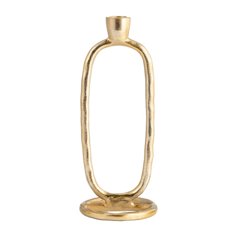 Fall into the ring of fire! The ring of fire being this metal candle holder, of course! This aluminum taper candle comes in a gorgeous gold color and features a unique oval cut-out design. The non-traditional look will add a stylish elegance to your home, office or event. Add as a glowing centerpiece for a dinner at home, or accent your coffee table, mantle, or bookshelf. The soft glow of a taper candle resting on top of this stunning oval cut-out metal holder will take your wedding or other special event to a new level!