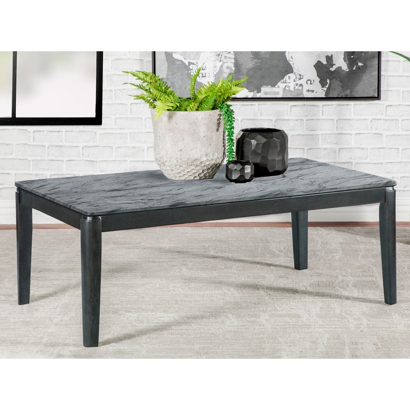 Transform a contemporary space into a minimalist home with this chic modern coffee table. This sophisticated coffee table features a spacious rectangular top that offers a faux grey marble design with realistic-looking striations and a sandy feel. The surface offers ample room for resting a drink, a tray of refreshments, or a tablescape of potted plants and decor. Elegant, slim legs project from aprons, all in a smooth black finish that offers a lovely contrast. Place this coffee table in an industrial style living room to complete a stylish seating arrangement ensemble. Includes: One (1) coffee table