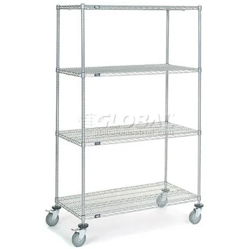 Our rugged electroplated nickel-chrome-finished industrial wire storage shelf design is highly durable, corrosion-resistant and attractive — and priced to save you money These NSF-approved units are a proven favorite for dry storage and display use because they’re maintenance free, discourage dust build-up and maximize visibility, access and air circulation. Easy assembly without tools. Shelves adjust at 1″” increments. Individual shelf capacity 600 lbs. 4 swivel casters and donut bumpers. 1 Year Limited Warranty when used in a dry storage application.