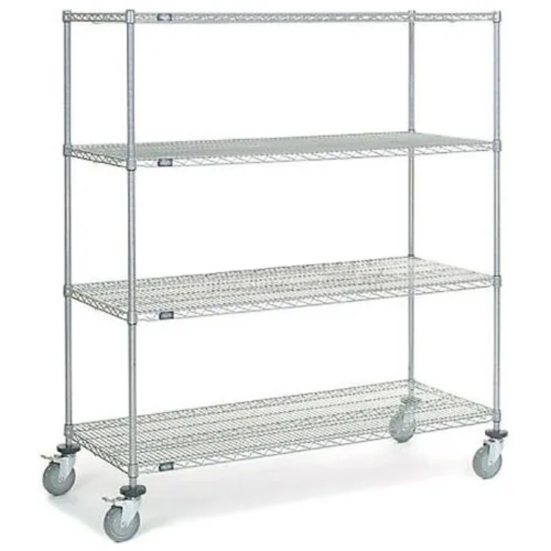 Keep supplies, equipment, and product mobile & easily accessible with the 4-shelf Nexel Chrome Wire Shelf Truck. It is made with rugged electroplated nickel-chrome-finished steel uprights & wire shelves to be highly durable, corrosion-resistant, and visually-appealing. Each shelf has truss reinforcements that push the payload capacity to 600-pounds per shelf, allowing them to hold heavy tools & equipment without bowing or bending. The open-sides & wire shelves are ideal for dry storage and display use because they are maintenance free, discourage dust build-up; and maximize visibility, accessibility & air circulation. Easy assembly without tools. NSF-approved. Limited 1-Year Warranty in dry storage applications.