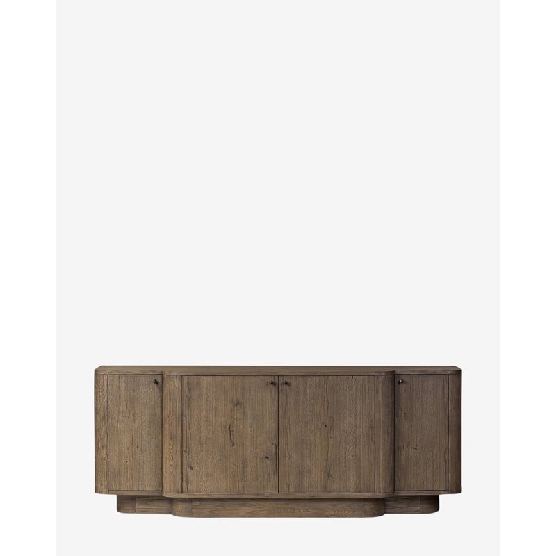 Crafted with weathered oak veneer, the Oswin Sideboard features a break-front design with rounded edges for an organic yet refined feel. The wide cabinet doors are complimented by aged bronze hardware accents for a touch of sophistication, while the simple