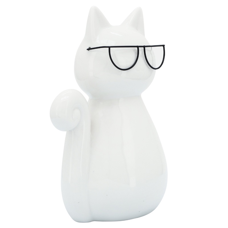 • This attractive porcelain sculpture features the shape of a cat sitting with his tail up along his body. It comes in a simple glazed white with black glasses as a fun accent.