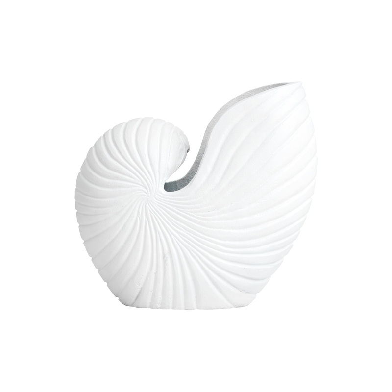 A beautiful conch shell in metal with a white finish.Use it as a flower pot or just as an elegant sculpture.Coated with lacquer inside for water resistance. For indoor use.NET WEIGHT KG:1.90HEIGHT:25.00 CMDEPTH:12.50 CMLENGTH:27.00 CMMATERIAL:Aluminium, wa