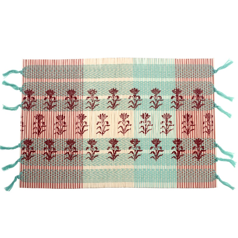 Add a touch of natural elegance to your dining setting with the Resham Phool Bamboo Placemat (13×19″). This handcrafted mat is made from eco-friendly bamboo and features delicate floral block prints in maroon on alternating mint green and beige panels. The handwoven detailing and soft tassels on the sides give it a warm, artisanal appeal.