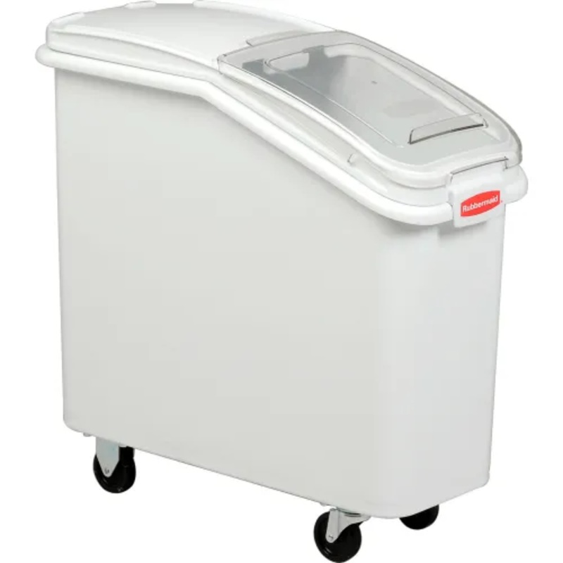 Slant Front Truck has lid that retracts into itself allowing easy access to contents when stored under a counter, plus includes a 32 oz. scoop and interior scoop hook. Rolls easily on 3″ rubber wheel casters (2 swivel, 2 rigid). NSF and USDA listed, and made of FDA compliant materials. Assemble easily.
