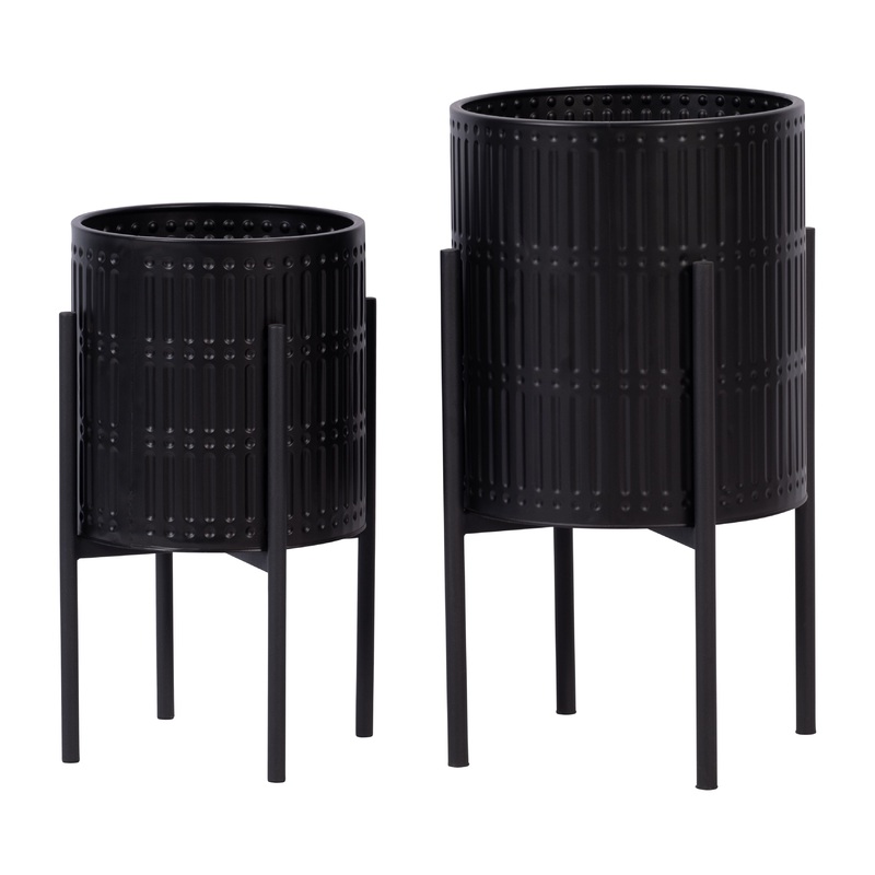 The Sagebrook Home Set of 2 Dot Dash Plant Pots on Metal Stands for Indoors or Outdoors are a plant lover’s dream. Crafted from metal, the planters showcase a black exterior with an embossed dot-dash pattern, on slim-legged black stands. The look is chic and casual, perfect for a transitional-styled home and patio. These modern floor planters give plants in growing pots a decorative place to grow. A great gift for plant lovers, this decorative planter set elevates your indoor and outdoor spaces.