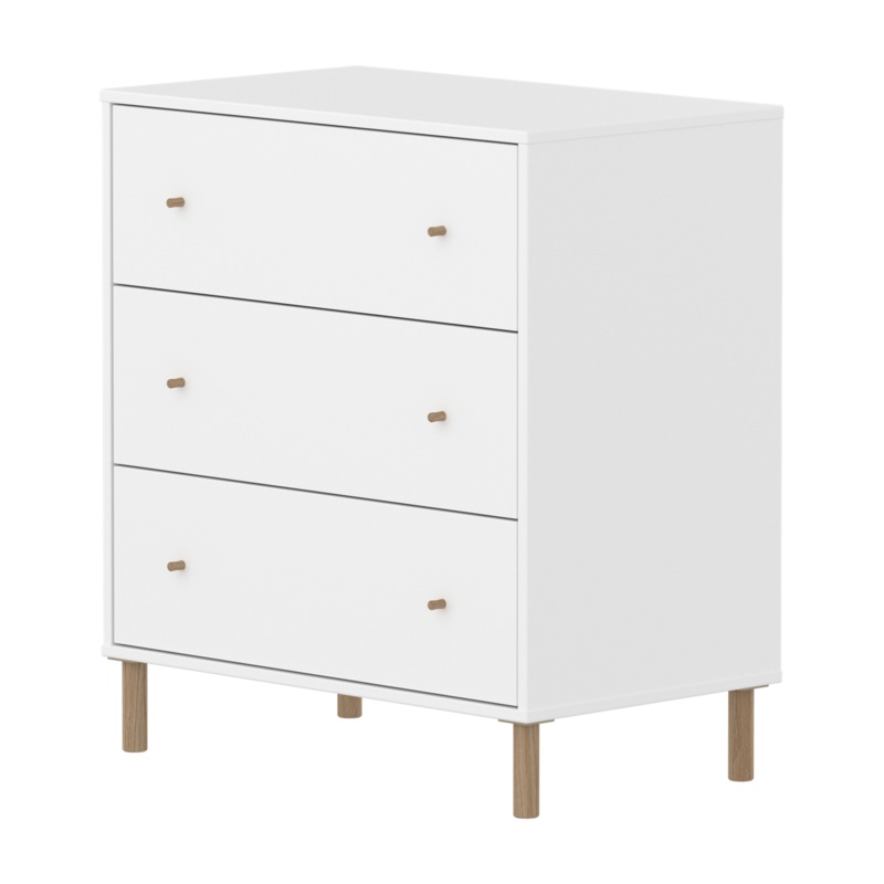 The SAGA Chest in full white features 3 drawers with soft-close mechanisms to protect little fingers. When using the plastic feet, the chest with 3 drawers can be placed under our mid-high beds for efficient use of space in the kids room. The round oak knobs add a simple, clean design element.