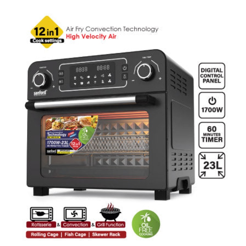 1700 Watts, Rotisserie, Convection, and Grill function.Stainless Steel Housing, Oven light ON/OFF.Double Glass Door, High-Speed Air Circulation Fan.60 Minutes Timer Function, 12 Preset Cook SettingsAdjustable Temperature from 80C-230C.Transparent Window, B