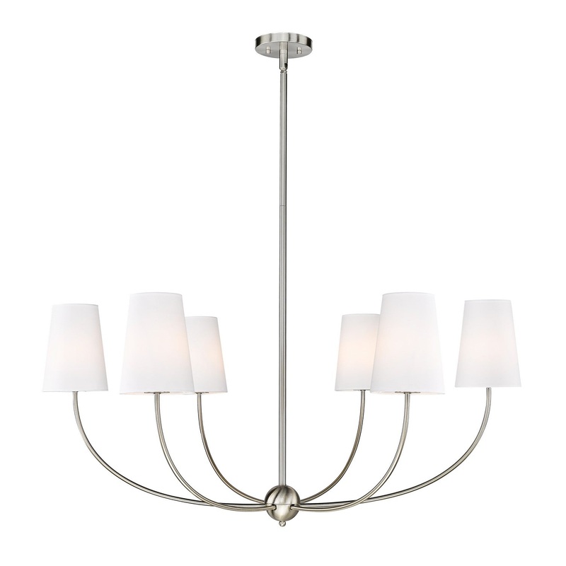 Choose the Shannon six-light chandelier to create an easy, low-key feel in a modern space. Embrace the graceful aesthetic of a brushed nickel finish steel frame with subtly curved arms and lights capped with classic white fabric shades reflecting traditional style. Infuse ambient lighting over a dining ensemble, in an entryway, or in a main living area with this tasteful chandelier.