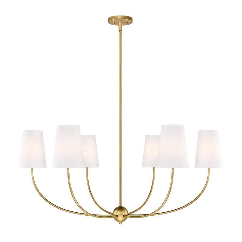 Modern design concepts count on versatility and style, and the Shannon six-light chandelier complies with a glowing, rich finish palette. This contemporary fixture features gorgeous rubbed brass finish steel framing with gracefully curved arms, a center orb accent, and traditional white fabric shades capping each candelabra lamp. Perfect for dining spaces, living areas, and entryways, this sophisticated chandelier is a natural choice.