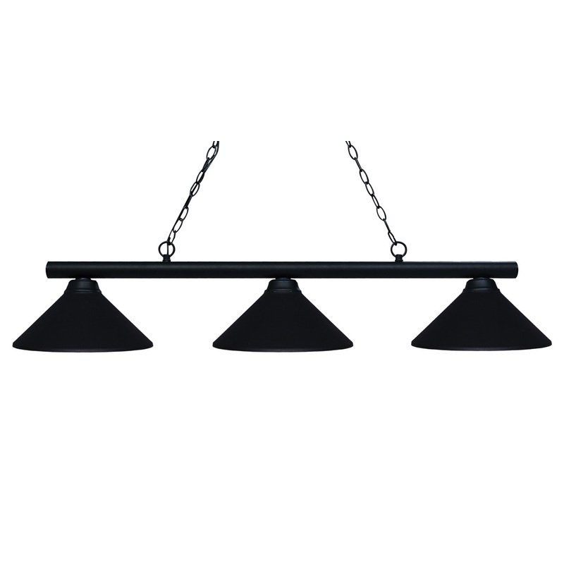The simple styling of this three light fixture creates a classic statement. Finished in matte black, this three light fixture uses matte black metal shades to compliment its classic look, and 36" of chain per side is included to ensure the perfect hanging
