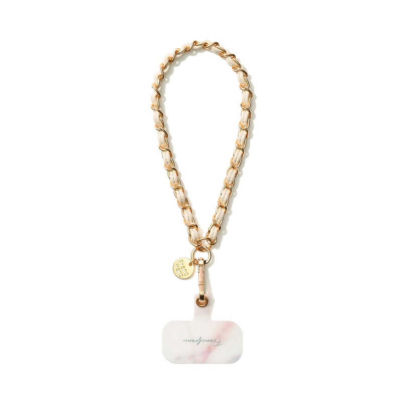 DescriptionThis is a hand strap that can be attached to a smartphone. It can be attached by sandwiching the sheet between your smartphone and smartphone case. The gold chain is gorgeous, and the design makes even casual outfits look more mature. Specificat