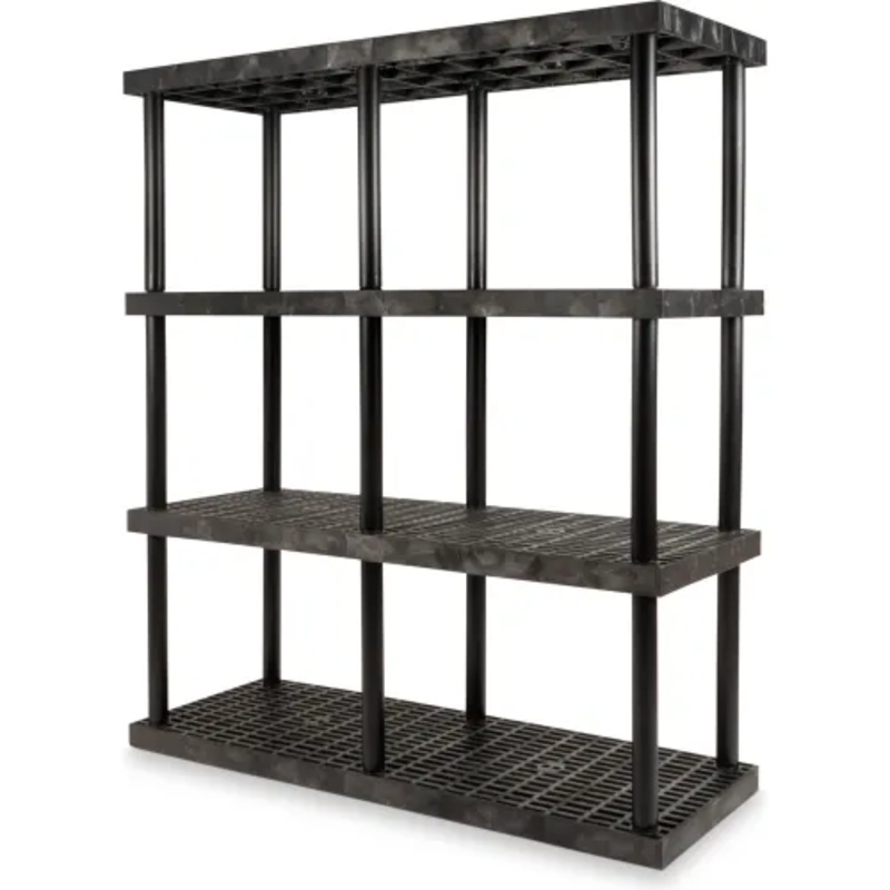 Withstands extreme temperatures in wet or corrosive environments. High density, black structural plastic resin is ideal for freezers and impervious to oils, salts, acids and most chemicals. Open grid design reduces dust accumulation, increases air and light penetration and promotes drainage. Strong 2-5/8″ thick shelves and 2-3/8″ diameter posts interlock together to form a rigid assembly. Stationary Shelf Unit has 25″ clearance between posts and 20″ between shelves. Virtually maintenance free. Steam cleanable. Quick and easy assembly, no tools required.