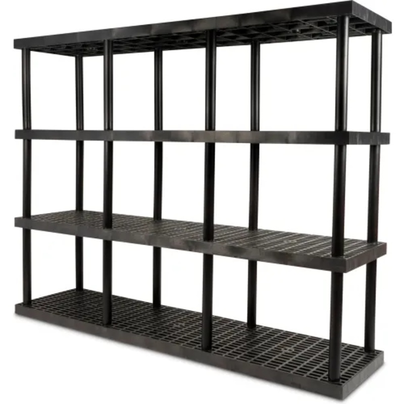 Withstands extreme temperatures in wet or corrosive environments. High density, black structural plastic resin is ideal for freezers and impervious to oils, salts, acids and most chemicals. Open grid design reduces dust accumulation, increases air and light penetration and promotes drainage. Strong 2-5/8″ thick shelves and 2-3/8″ diameter posts interlock together to form a rigid assembly. Stationary Shelf Unit has 25″ clearance between posts and 20″ between shelves. Virtually maintenance free. Steam cleanable. Quick and easy assembly, no tools required.