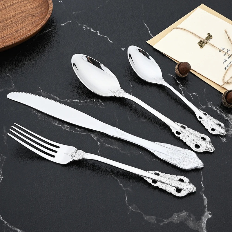 Stainless steel dinner set of 24-pieces. This dinnerware set of stainless steel flatware cutlery includes knives, forks, and spoons. The retro luxury silverware set is enough place settings for six people.